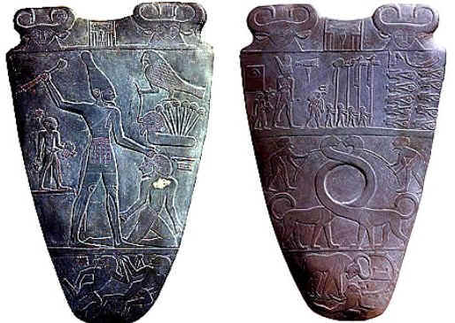 A slate palette from Heirakonpolis, shows triumph of King Nar-mer (first Pharaoh of a united Egypt)
